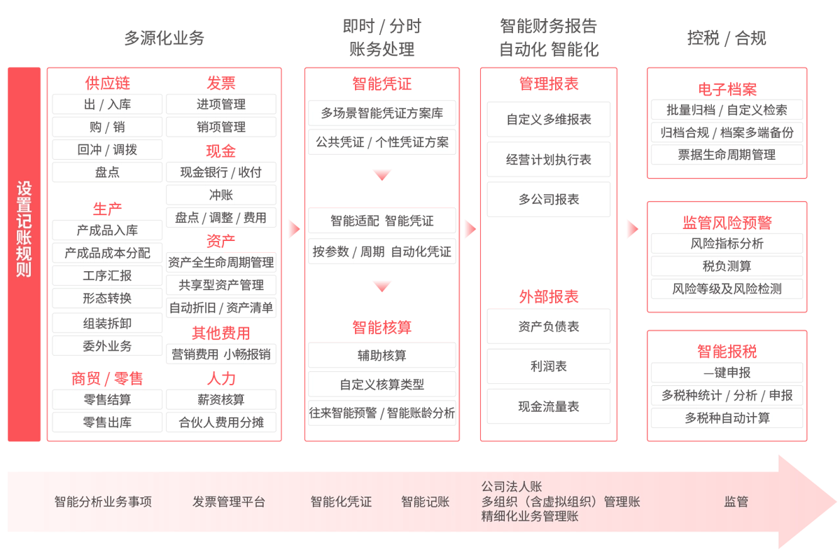 智能凭证根据业务、财务、资产等6组38种事项来源,自定义凭证生成方案,自动生成凭证